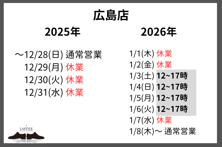 広島店は12/28(日)まで営業、1/3(土)より営業開始となります。